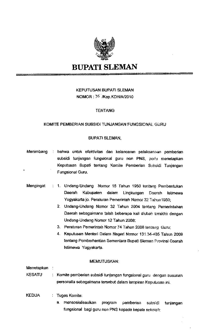 Keputusan Bupati Sleman No 36 Kep Kdh A 2010 Tahun 2010 Tentang Komite Pemberian Subsidi Tunjangan Fungsional Guru