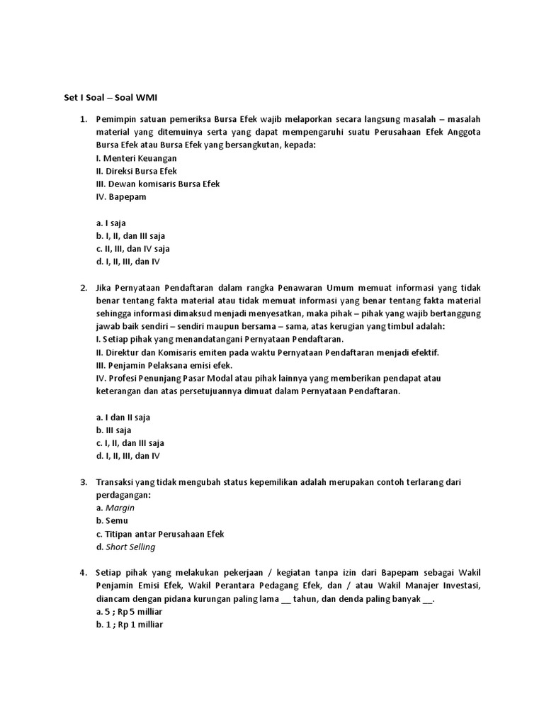 Soal ujian wakil penjamin emisi efek. Jasa penjamin emisi efek merupakan layanan jasa terkait dengan penawaran umum perdana saham initial public offering secondary offering obligasi dan sukuk obligasi syariah divisi investment banking akan membantu dan mendampingi klien dalam pendanaan pasar modal baik dalam hal penggalangan dana melalui penjualan saham di pasar modal mekanisme penawaran umum kepada masyarakat maupun. Persentase materi ujian wakil perantara pedagang efek wppe undang undang pasar modal undang undang ri no. Bursa efek jakarta be j dan bursa efek surabaya bes di merger dan menjadi satu nama pada tahun 2007 yaitu mldr.